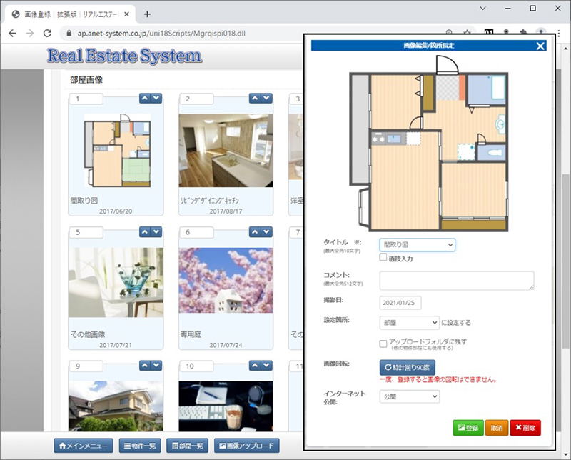物件と部屋に画像データを関連付けさせる画面です。 画像登録は専用の入り口からログインし登録していきます。 画像ごとにタイトル・コメント等を入力し、画像の向きが違う場合は回転させて正しい方向に合わせて登録を行います。