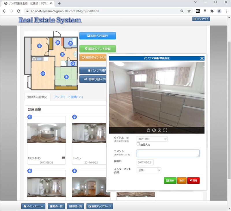 物件と部屋に登録されている間取り画像にパノラマの画像データを関連付けさせる画面です。 パノラマ画像登録は専用の入り口からログインし登録していきます。 パノラマ画像ごとにタイトル・コメント等を入力し、登録します。登録後間取り画像に撮影ポイントを設定します。