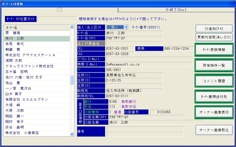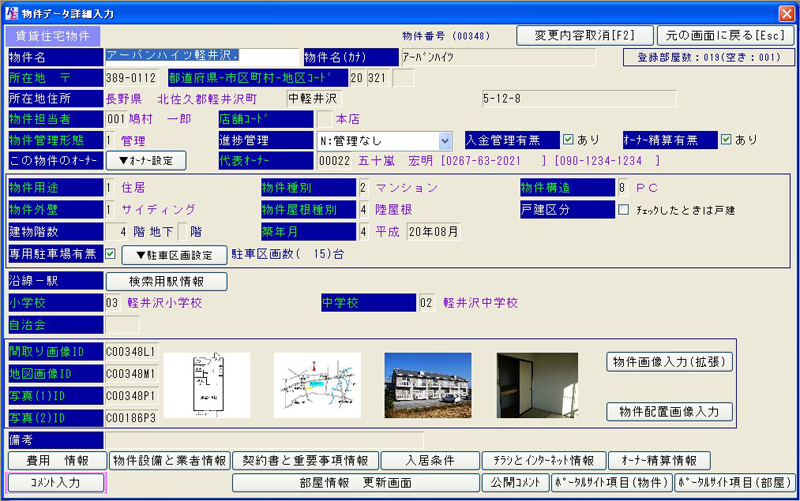 オーナー様の所有物件情報(種別・構造・間取り・画像・契約者)などの情報管理が行えます。