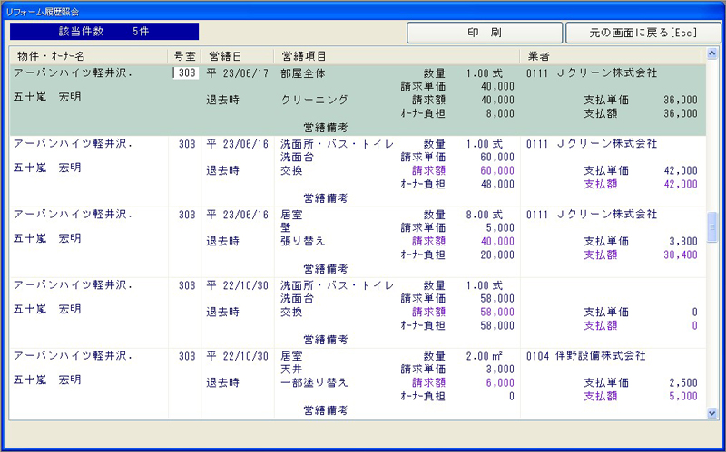 入居や退去時の確認表作成・部屋や共用部分のリフォームなどの修繕記録の情報管理が行えます。